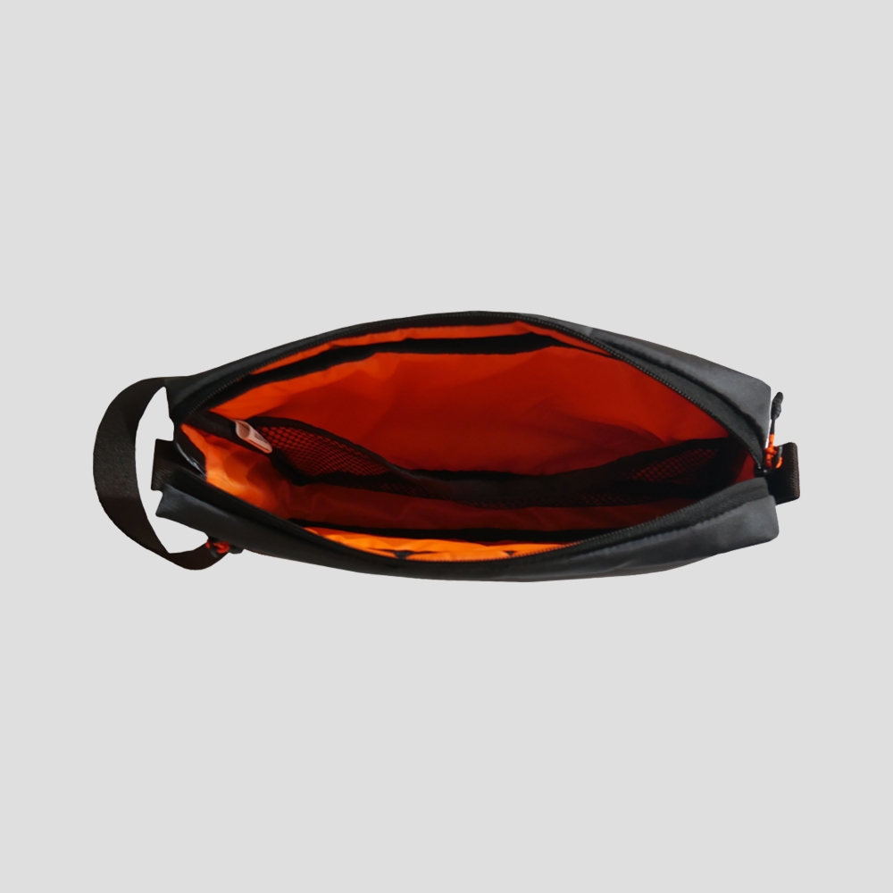 Clutch ini memliki 2 kompartemen ya itu di bagian atas sebagai kompartemen utama dan ada jaring untuk membawa barang kecil agar mudah dalam memisahkan. Lalu ada kompartemen di bagian depan untuk penyimpanan barang-barang kecil seperti charger dan barang lainya. Bagian tali genggaman menggunakan tali jenis bahan katun yang kuat dan lembut saat digunakan.
