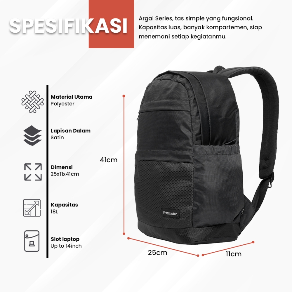 ARGAL adalah salah satu series Daypack urbanfactor, Daypack minimalis dengan desain elegan, ringan, dan nyaman untuk aktivitas harian, cocok untuk kerja, kuliah, atau jalan santai.
