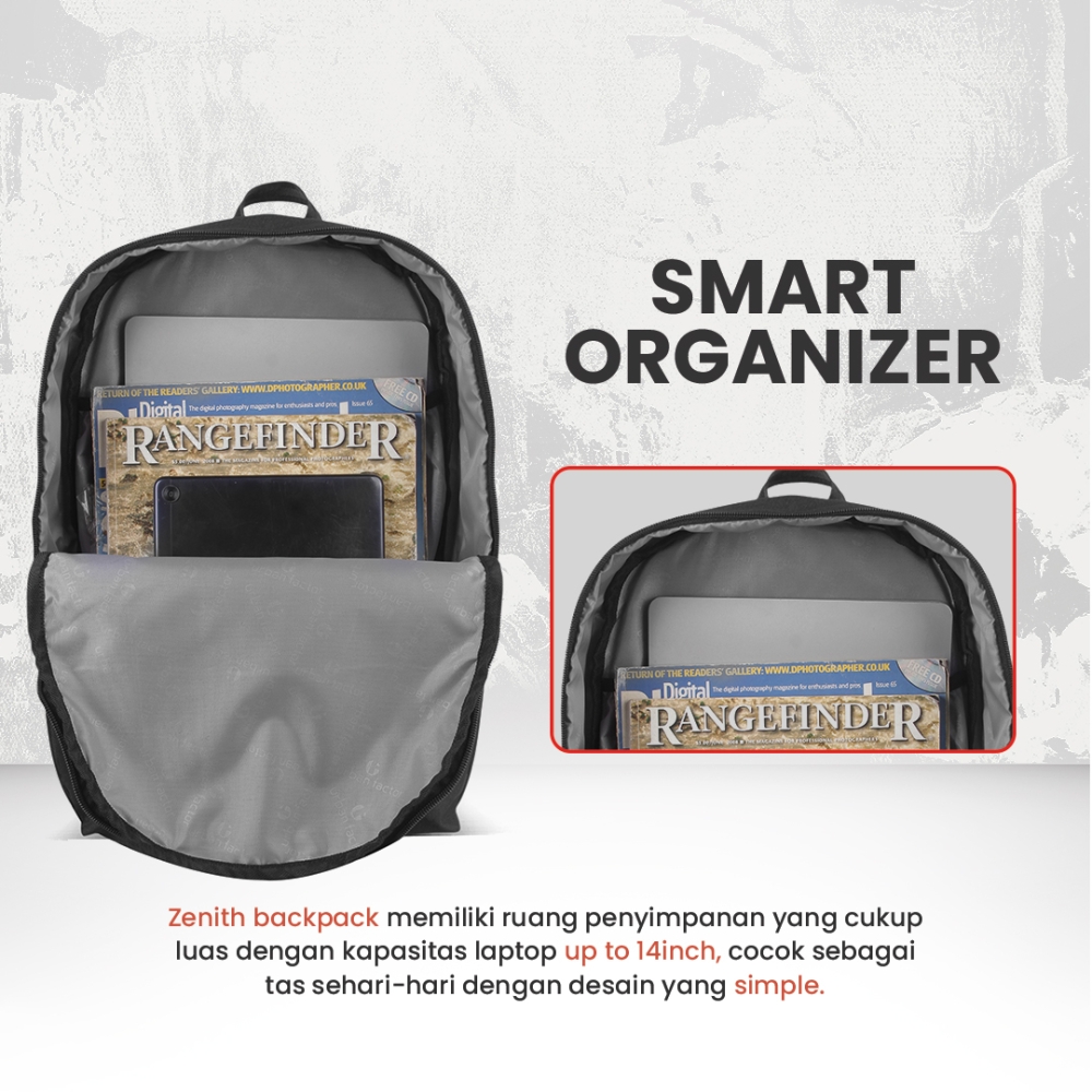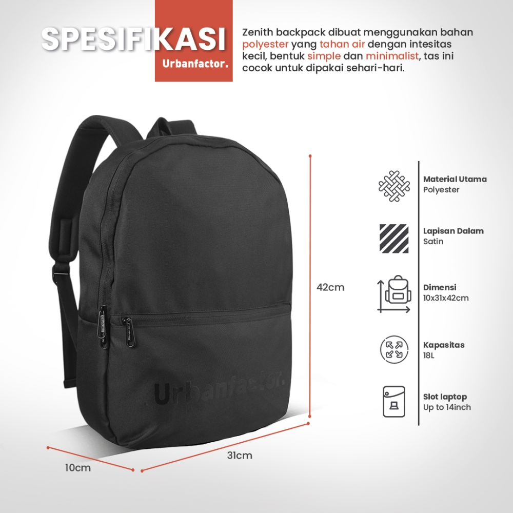Zenith adalah salah satu series Daypack urbanfactor, Daypack minimalis dengan desain elegan, ringan, dan nyaman untuk aktivitas harian, cocok untuk kerja, kuliah, atau jalan santai.