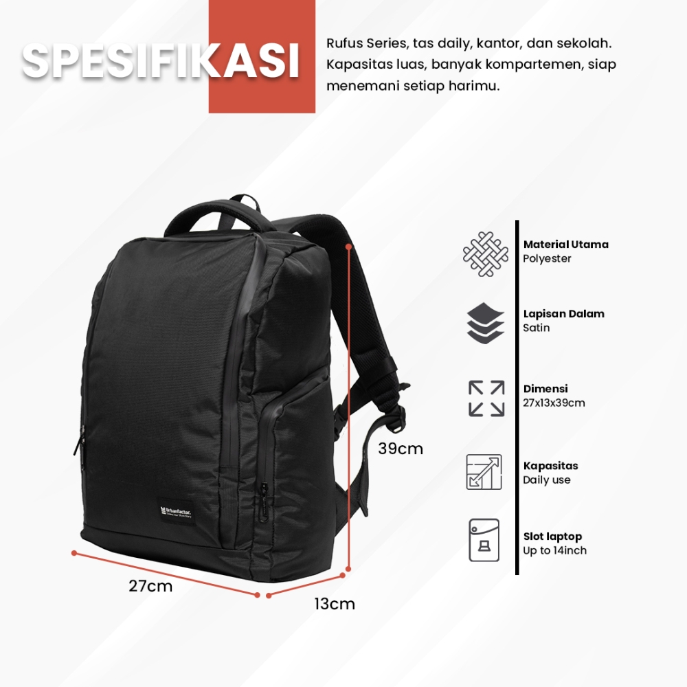Rufus adalah salah satu series Backpack urbanfactorr, Backpack minimalis dengan desain elegan, ringan, dan nyaman untuk aktivitas harian, cocok untuk kerja, kuliah, atau jalan santai.