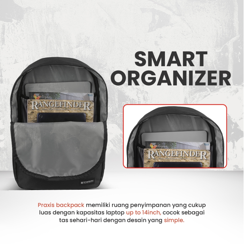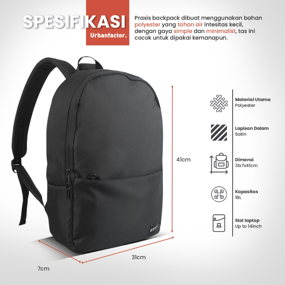 "Praxis adalah salah satu series Daypack urbanfactor, Daypack minimalis dengan desain elegan, ringan, dan nyaman untuk aktivitas harian, cocok untuk kerja, kuliah, atau jalan santai.